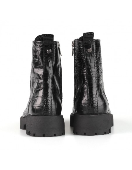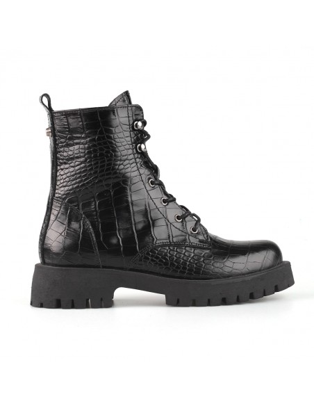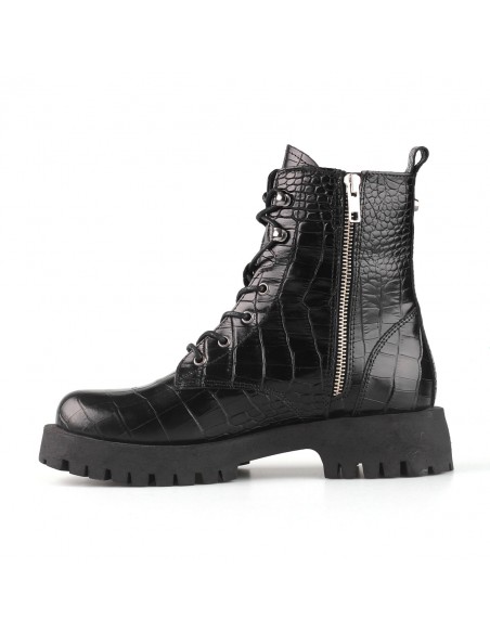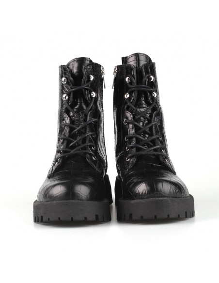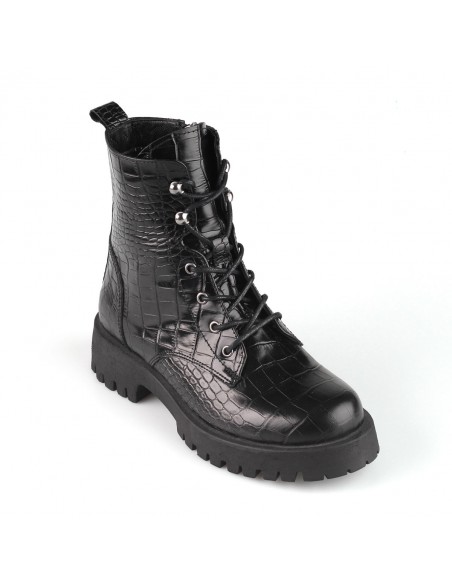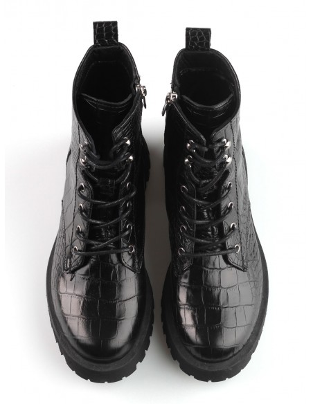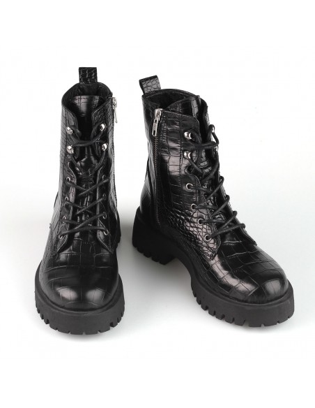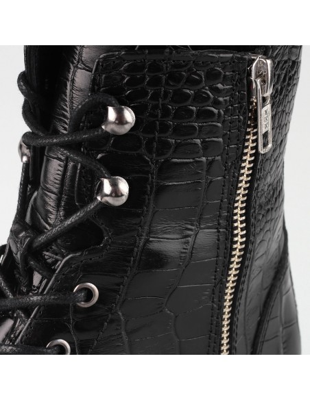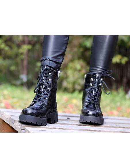 Sznurowane trapery wykonane z wysokiej jakości skóry naturalnej imitującej skórę krokodyla - modny trend ostatnich sezonów. Wygodne i z pazurem, świetnie spawdzą się w miejskich stylizacjach.